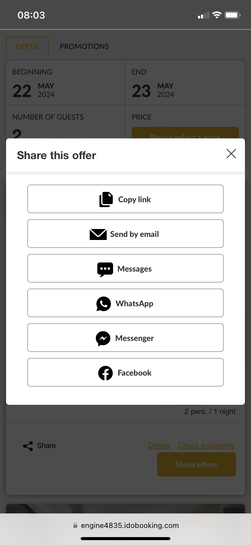 We have implemented a new feature for convenient sharing of specific offers in your Booking Engine. From now on, you can send your guests a direct link in your preferred way: via WhatsApp, Messenger, email, or SMS. You can also quickly copy several offers for comparison or share a promotion on your Facebook profile.