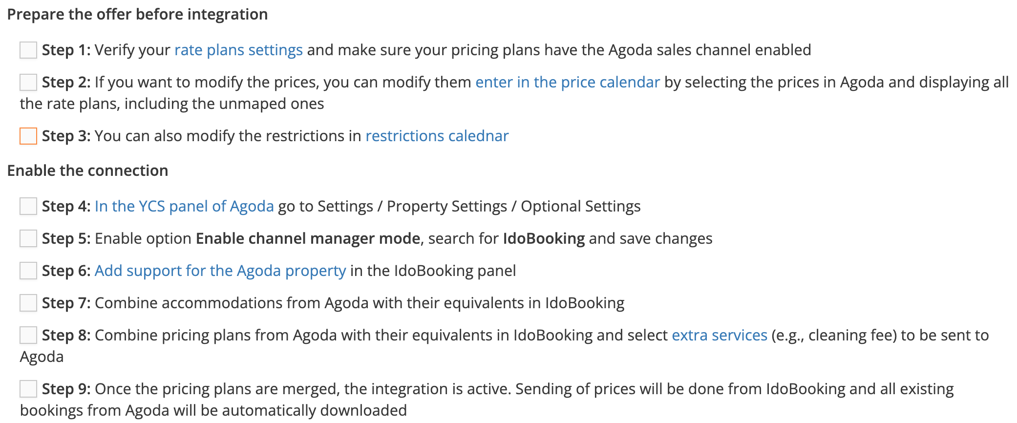 If you don't have an Agoda account yet, you can easily create a new account, create places to stay and prepare an offer on the site. Next, go to the tab in IdoBooking: Channel Manager / Agoda integration details and follow the instructions from the integration setup helper.