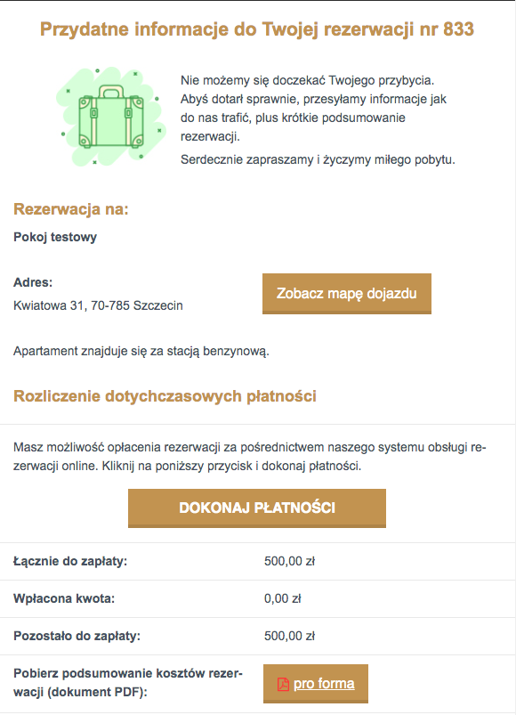 Dotychczas instrukcja dojazdu była zamieszczona w szablon e-mail z informacją o nadchodzącym pobycie, który był wysyłany dzień przed przyjazdem. Zmodernizowaliśmy zawartość tego szablonu, ograniczając jego zawartość do kluczowych informacji potrzebnych przed samym przyjazdem takich jak: krótkie podsumowanie rezerwacji, mapa dojazdu oraz instrukcja dojazdu (jeżeli została dodana).