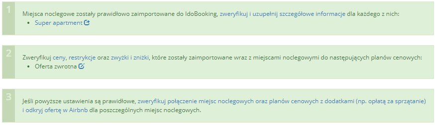 Do tej pory posiadając ofertę w serwisie Airbnb, konieczna była osobna konfiguracja oferty po stronie panelu IdoBooking. Konieczne było utworzenie miejsc noclegowych, planów cenowych, czy restrykcji pobytu oraz odpowiednie ich połączenie z tymi obowiązującymi w serwisie.