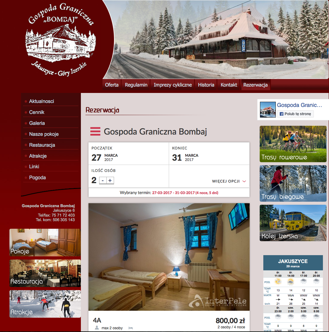 Wykorzystanie kalendarza rezerwacji na stronie internetowej Gospody Granicznej Bombaj