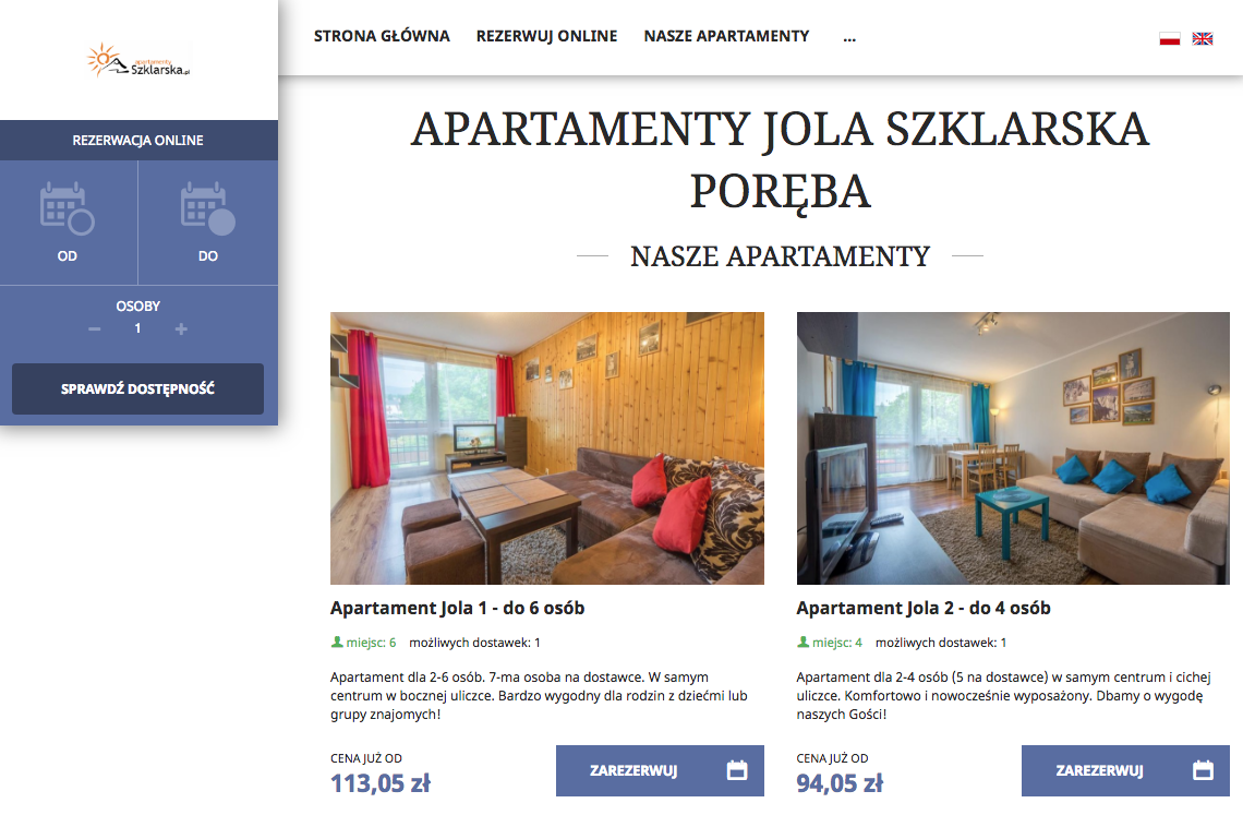 opinia o systemie rezerwacji"IdoBooking to bardzo rozwojowy system, dzięki któremu możemy jako niewielki obiekt noclegowy, wdrożyć sprzedaż noclegów on-line. Zarządzanie apartamentami jest łatwe i umożliwia odpowiednie dopasowanie informacji do naszych obiektów. Prezentacja apartamentów na stronie internetowej - darmowej wizytówce - jest przejrzysta i łatwa do czytania przez turystów. Instalacja widgetu rezerwacji na stronie internetowej www.apartamentyszklarska.pl przebiegła bardzo szybko. Korzystanie z systemu rezerwacji przez klientów jest łatwe i umożliwia turystom sprawdzenie dostępności i ceny wynajęcia mieszkań w pięknych polskich górach. Zespół IdoBooking jest otwarty na wszelkie uwagi, co zasługuje na specjalne słowa uznania. Przekazywane sugestie są wdrażane szybko, a co najważniejsze tak, aby pasowały do naszej działalności. Pomimo nowego systemu korzystamy z niego ze względu na łatwość uruchomienia i konfiguracji, ale także przez niskie koszty utrzymania. System na pewno sprawdzi się w małych i średnich obiektach noclegowych."