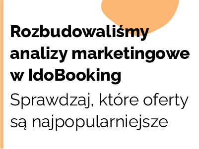 Rozbudowaliśmy analizy marketingowe w IdoBooking. Sprawdzaj, które oferty przynoszą najwięcej zysków Od teraz możesz korzystać z dodatkowej analizy średniej sprzedaży pokojonocy z podziałem na oferty. Sprawdzaj, które oferty cieszą się największym zainteresowaniem wśród Twoich gości i przynoszą Ci na... Przeczytaj wpis